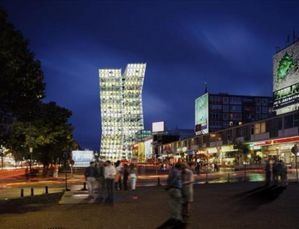 «Танцующие башни» расположены на улице Репербан в Гамбурге. И представляют собой две башни из стекла и стали, визуально наклоненные друг к другу, при этом верхние их части, наоборот, повернуты в разные стороны. Все это напоминает танцующую пару в виде двух зданий высотой около 90 метров.
